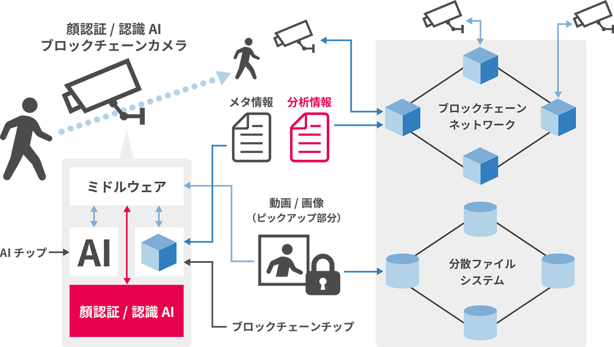 AIによって得られる顔認識情報等はブロックチェーンに記録することでデータの安全性が担保でき、ブロックチェーンによって追跡調査を迅速化することができます。