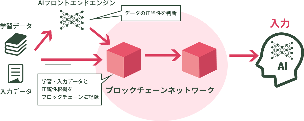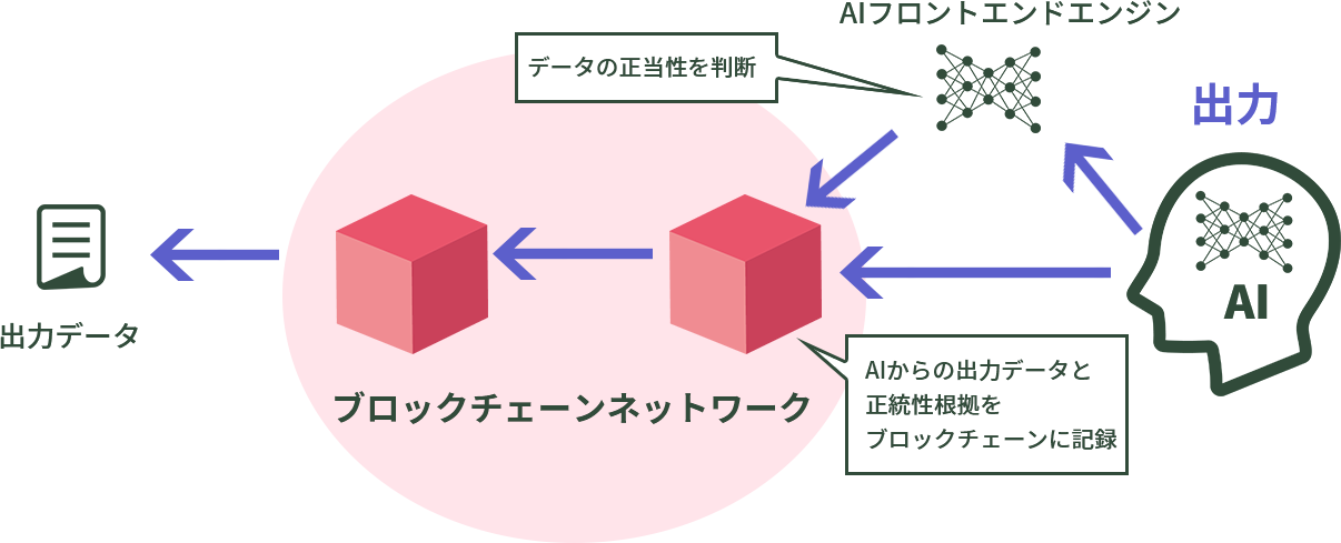 AIとの入出力データに対して知的財産権やポリティカルコネクトネスに関する正当性を判断するAIフロントエンドエンジンの結果を合わせてブロックチェーンに記録することで、AI生成物の正当性を証明することが出来ます。