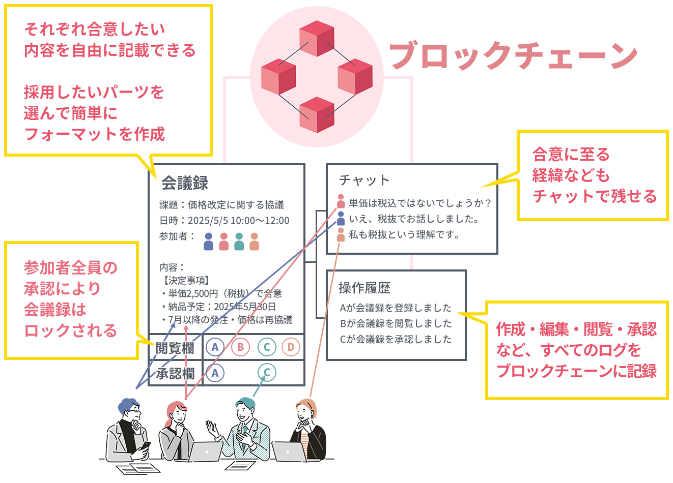 合意に至る経緯と結論を改ざん不能なブロックチェーンに記録しトラブル回避と判断スピードを促進!