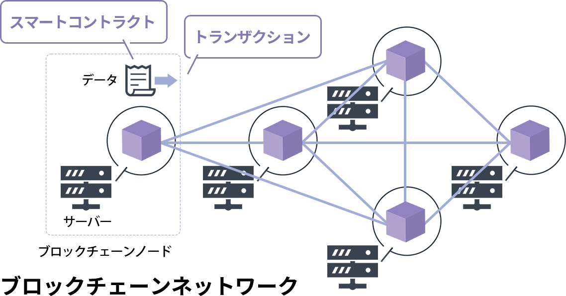 「ブロックチェーンノード」が行うデータ送信は、ブロックチェーン環境(ブロックチェーン専用のプロトコル)によってデータが安全に処理されます。