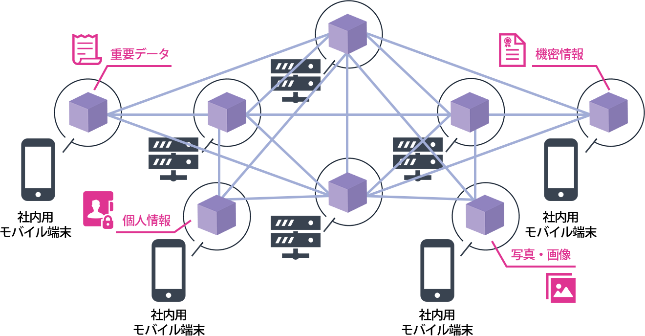 また送信するデータは暗号化/分散化しており盗難されても解読不可能です。