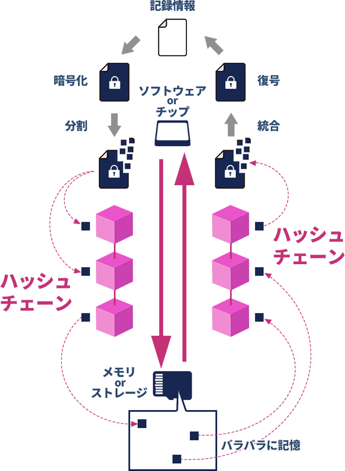 情報は暗号化され、複数の断片に分割されて保存されています。