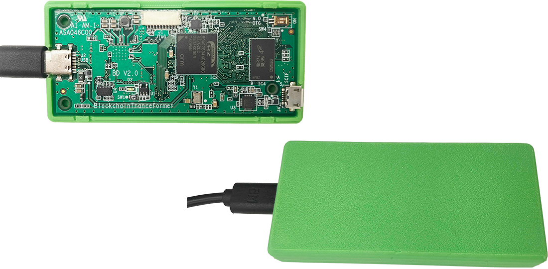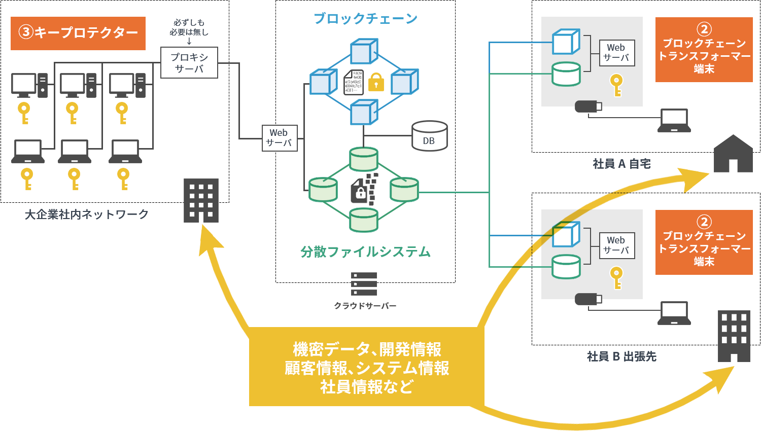 リモートワーク時、重要データを用いて自宅で作業することも多々発生します。自宅や外部のネットワークを使用するので、企業内のようにセキュリティは強化されていないため、不正アクセスのリスクが高くなります。ブロックチェーントランスフォーマーであれば、PCにUSBを指すだけで、共有データをブロックチェーンで守ることができます。