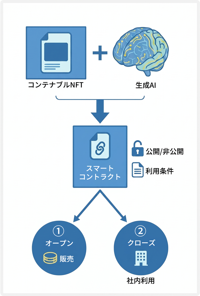 このシステムを支えるのがシーズの特許技術「コンテナブルNFT」と生成AIを融合された仕組みです。
