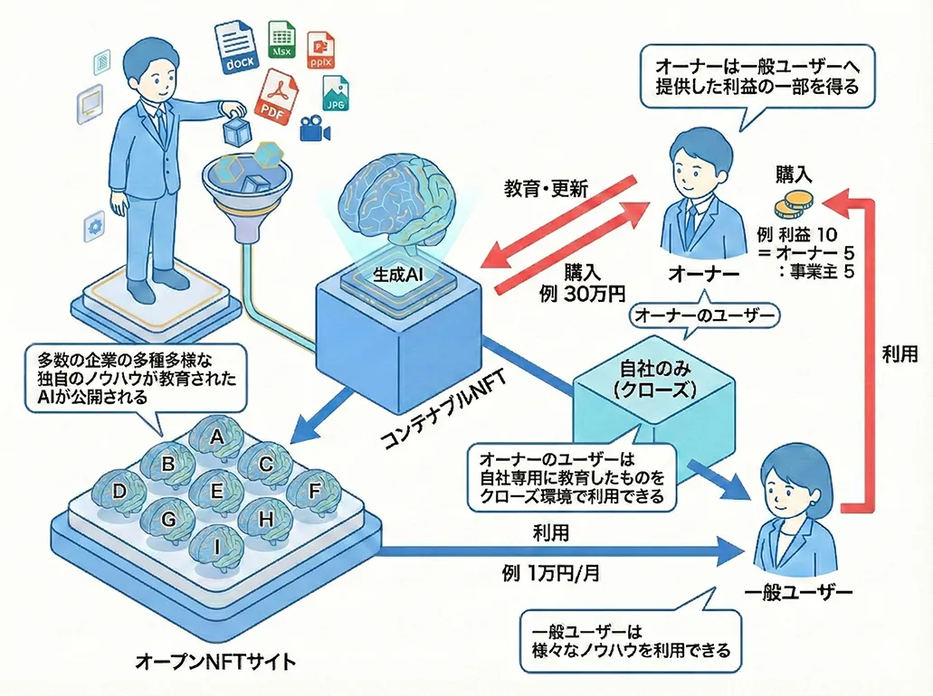 社内マニュアルや独自データを登録するだけで販売可能な「AI商品」が完成。専門知識をパッケージ化し市場価格のあるデジタル資産として発行します。