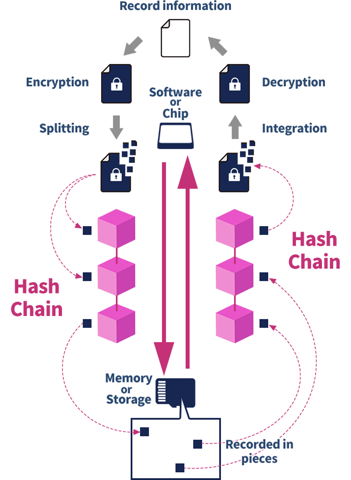 The hash-chain structure makes all records "linked" so that even a single rewrite can be detected immediately.